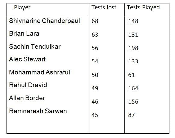 West Indian batsman Shivnarine Chanderpaul tops the list of batsmen who have featured in most Test losses during their career. The list has three West Indian players and two Indian players, the most from any team.