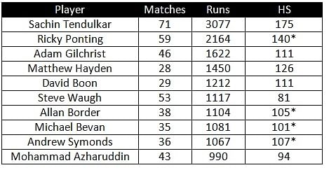 Sachin Tendulkar has scored the most number of ODI runs (3077) in India vs Australia matches.