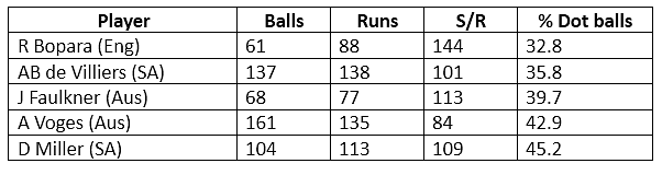 Considering all the batsmen who have played a minimum of 50 balls, here is a list of players who have had the lowest percentage of dot balls. Ravi Bopara leads the list, having played only a 32.8% of dot balls. Bopara, who came in at No.6 or No.7 in the tournament, had lesser time to settle and was aggressive in all the games.