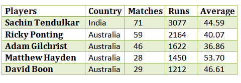 Four of the top five run-scorers happen to be Australian players, leaving Sachin Tendulkar to be the only Indian on the list. Tendulkar, as he does more often than or not, tops the list by an overwhelming margin. He is followed by none other than Ricky Ponting. No doubt, the upcoming ODI series will be poorer without the presence of these two legends.