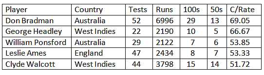 Here is a list of batsmen with the best conversion rate in Tests. Only batsmen who have scored 2000 plus career runs are taken into consideration. With a conversion rate of 69.05, Don Bradman stands first in the list.