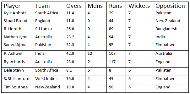 This is the best bowling figures in an innings in Test matches in 2013 so far. Here are the 10 best performances so far in Tests this year: