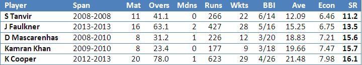 Tanvir has played only in the first season of IPL. James Faulkner has a strike rate of 13.5 and he had played only the last season(2013) of IPL.