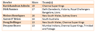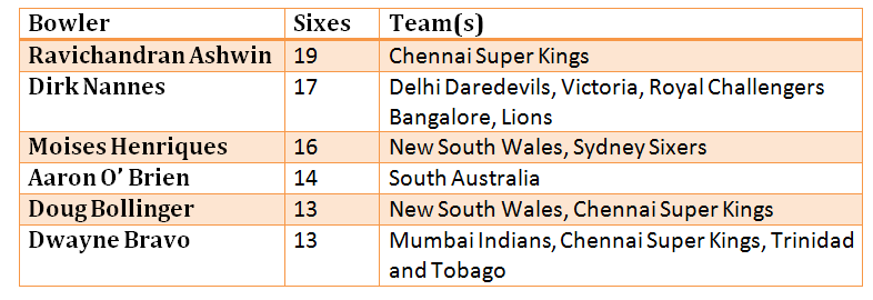 Here is a list of bowlers who have conceded the most number of sixes in the four completed seasons of Champions League T20. Having conceded 19 sixes, Indian off-spinner Ravichandran Ashwin tops the list.