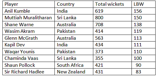 Here is a list of bowlers who have taken the most number of wickets in Test cricket by Leg before wicket. Despite taking considerably lesser number of wickets than Shane Warne and Muttiah Muralitharan, Anil Kumble has trapped more batsmen LBW.