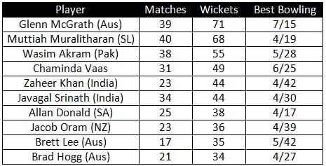 Glenn McGrath of Australia has taken most wickets (71) in the ODI World Cups in 39 matches.