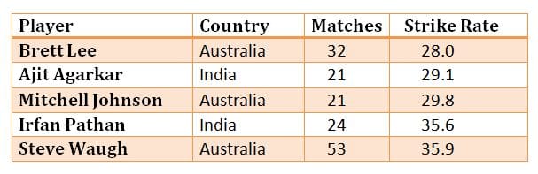 Here is a list of bowlers with the best bowling strike rate in the One-Day International matches between India and Australia. Having taken a wicket every 28 balls he bowled, the Australian fast bowler Brett Lee tops the list.