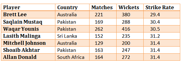 Australian fast bowler Brett Lee, who averages a wicket every 29 deliveries he bowls, tops the list.