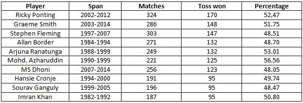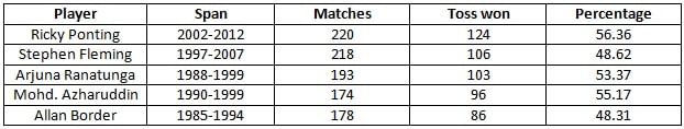Ricky Ponting has had the most success at the toss overall. The former Aussie skipper won more than 50% of the tosses during his stint as captain followed by Graeme Smith and Stephen Fleming. Here is a list of the top 10.