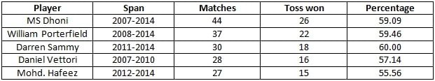 Indian skipper Mahendra Singh Dhoni has had lady luck smiling on him at the toss in T20 Internationals. Dhoni has won the toss 22 times out of 37 occasions. Here is a list of the top 5.