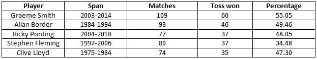 Recently retired South African captain Graeme Smith has had the most luck with the toss in Test cricket. The Proteas captain has won the toss 60 times out of the 109 he has been involved in. Here is a list of the top 5.