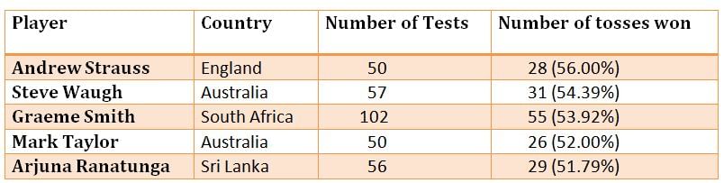 Here is a list of captains who have the best toss winning percentages in Tests. Only players who have captained their teams in at least 50 Tests are taken into consideration. Former England captain Andrew Strauss stands first on the list, having won the toss 28 times in his 50 Tests as captain.