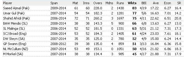 South African speedster Dale Steyn, who bowled a spectacular last over to defend 7 runs against New Zealand and give his team their first victory in the T20 World Cup 2014, reached the landmark of 50 wickets in the shortest format. Known more for his class in Test cricket, the fact that his 50 wickets have come at an economy rate of 6.24 shows how versatile the fast bowler has become, of late.