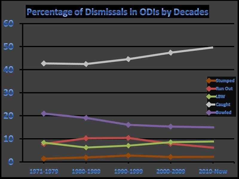 We decided to dig some numbers to verify whether the above-stated 'caught' or 'bowled' dismissal ratio phenomena is true or we have been deluded by the fact that mostly 'bowled' dismissals are popular from the past century since they are more spectacular. We decided to check dismissals in ODI matches from 5th Jan 1971 to this day, decade by decade.