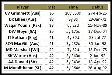 Australian leg spinner, Clarrie Grimmett, who is regarded the inventor of the ‘flipper’, holds the record for the fastest player to reach 200 wickets in Tests by wickets. Countryman Dennis Lillee is tied for second place with Waqar Younis at 38 matches.