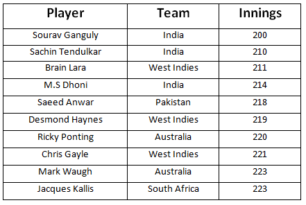 A list of batsmen who had taken fewest innings in ODI to reach 8000 runs is given below. Ex-Indian captain Sourav Ganguly is at the top of the chart, who took 200 innings to reach the above said milestone.