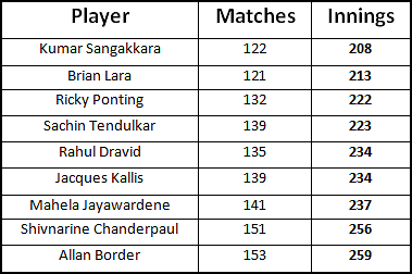 Kumar Sangakkara is at the top of the list of batsmen who took fewest innings to reach 11,000 runs in Test cricket. He reached the milestone in just 208 innings. He played his 208th inning against Bangladesh where he scored a mammoth 319 runs to reach 11,000. Brian Lara is second to Sangakkara who took 213 innings to reach 11,000 Test runs.