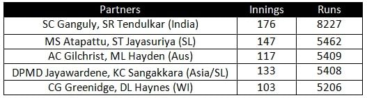 The now-retired Indian pair of Sourav Ganguly and Sachin Tendulkar have scored the most number of runs together in One-day Internationals. Here is the top 5 list.