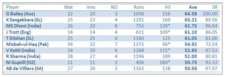 Kumar Sangakkara of Sri Lanka had an average of 63.21 and the Indian skipper, MS Dhoni had an average of 62.75.