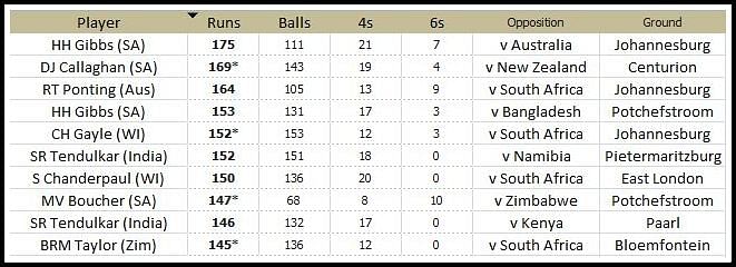 Herschelle Gibbs leads the way with the unforgettable knock of 175 against Austrailia in their chase of 434 runs. Ricky Ponting claims third, with 164 in the same match at Johannesburg. Most of the high scores have been scored at Johannesburg, a testament to the small size of the ground.