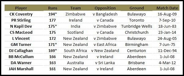 Charles Coventry of Zimbabwe scored the highest ever maiden hundred against Bangladesh in 2009. The right hander stayed unbeaten on 194. Indian legend Kapil Dev makes it to the list with his unforgettable 175 not out against Zimbabwe in the 1983 World Cup.