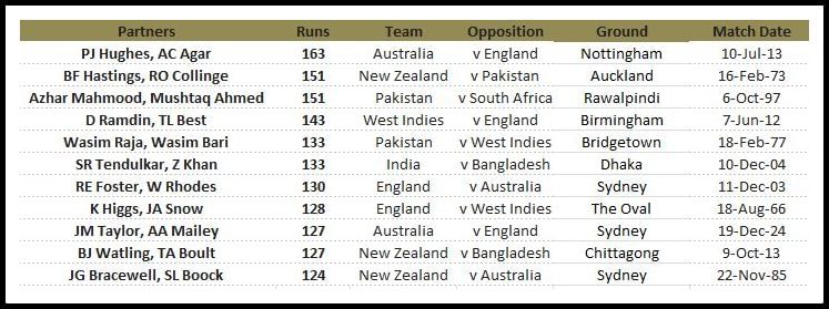Phil Hughes and Ashton Agar broke a 30 year old record in 2013 by posting 163 runs for the last wicket against England in the Ashes to drag Australia out of danger.