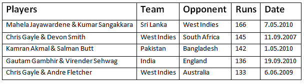 Here is a list of highest partnerships in the history of ICC World T20s. Having scored 166 against West Indies in the 2010 World Cup, Sri Lankan pair of Mahela Jayawardene and Kumar Sangakkara top the list.