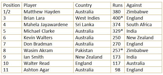 Ashton Agar, on his debut, in the recently concluded Ashes series, created the record for the most number of runs scored by a number eleven batsman ever in Test cricket. Here is a list of highest scores made by different batsmen in each batting position.