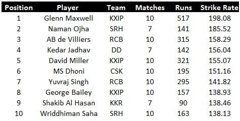 Here, we look at the ten players with the highest strike rates in IPL 2014. It will not come as a surprise to anyone that the man leading this particular list is Glenn Maxwell. The young Australian batsman has demolished anything and everything that has come his way over the last month.