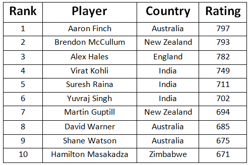 In the recently published ICC T20 rankings, Australia’s hard hitting batsman Aaron Finch is at the top of the rankings with 797 rating points. He is followed by New Zealand’s Brendon McCullum. India’s Virat Kohli, Suresh Raina and Yuvraj Singh also feature in the list at 4th, 5th and 6th position, respectively.
