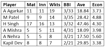 Ajit Agarkar leads the list with 19 wickets from 11 games, followed by Munaf Patel and Harbhajan Singh.