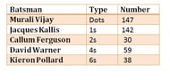 Here is the list of individual batting performances in the Champions League. Murali Vijay has played the most number of dots while Kieron Pollard has hit the maximum number of sixes.