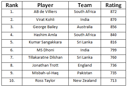 AB de Villiers retains the top position in the ICC ODI rankings for batsmen with a rating of 872.