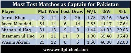 What is interesting to note is that Misbah has won a greater percentage of Tests as captain than Miandad and Imran. However, Wasim Akram is the more successful Test captain in terms of % wins, winning 48% of his Tests as captain of Pakistan.