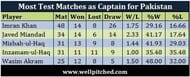 Miandad, Imran and Akram also rank above Misbah in terms of W/L ratio in Tests as Pakistan captain.