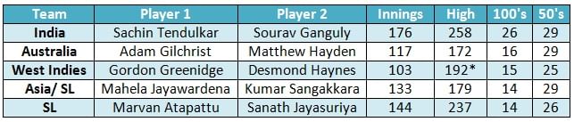 The Indian batting pair of Sachin Tendulkar and Sourav Ganguly have scored the most number of 100+ partnerships (26) in One Day Internationals. Next in the list is Adam Gilchrist and Matthew Hayden of Australia, who have partnered 16 hundred plus partnerships. Here’s the list of Top 5 pairs: