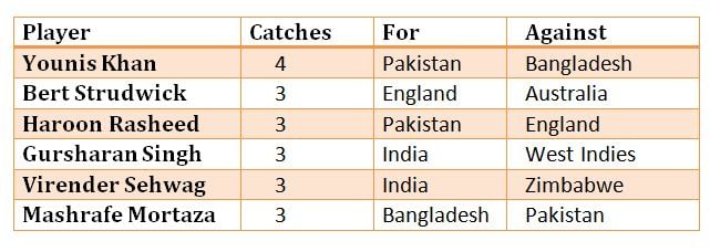 Pakistan’s veteran batsman Younis Khan has taken the most number of catches in an innings as a substitute