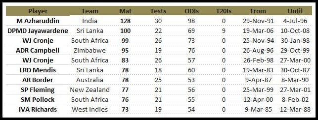 Mohammad Azharuddin leads the way with 128 consecutive international matches as captain for India. The right handed batsman stayed skipper for close to 5 years managing 30 Tests and 98 ODIs on the way. Mahela Jayawerdena is second in line with 100, while the late South African all rounder Hansie Cronje is third with 99.