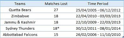 The league leaders of this unfortunate list are Quetta Bears from Pakistan, who had lost an incredible 27 matches on the trot. While the last team to make it to this rather infamous list is another team from Pakistan, the Abbottabad Falcons.
