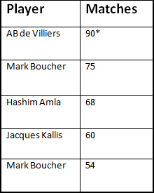 The other players who feature in this list are Jacques Kallis, Hashim Amla and Mark Boucher. Boucher features in this list twice. He surpassed his own record of 54 consecutive matches by playing 75 consecutive matches on a different occasion.