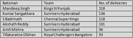 The list of batsman who have faced the most deliveries without hitting a six is headed by Mandeep Singh of Kings XI Punjab. It is surprising given that Mandeep has been opening for the Kings XI throughout the season. As shown by the table below he has failed to start the innings with a bang, especially given the fact that sub-continent is considered the heaven for opening batsman. The other interesting stat is the fact that this table includes as many as three Sunrisers batsman, which clearly sums up their batting woes throughout the season, and if are knocked out of the tournament then a part of the blame should go to their batting unit.