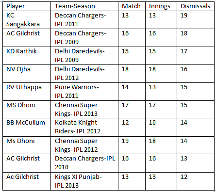 These statistics list the top ten maximum dismissals made by a wicket-keeper in a particular IPL series.