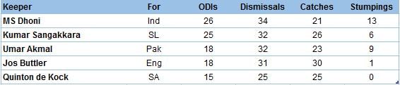 Indian captain, M. S. Dhoni leads in the most dismissals by a wicketkeeper with 34 dismissals in 26 ODIs.