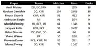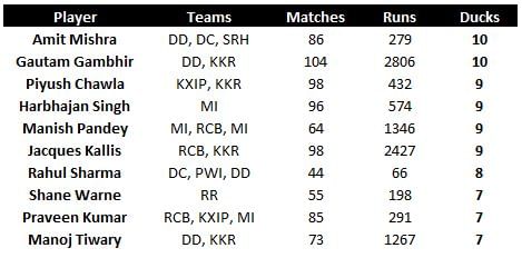 Leading the table are Amit Mishra and Gautam Gambhir with 10 ducks each. Gambhir started this season of the IPL with 3 ducks in the first three matches, which pushed him to the top of this list.