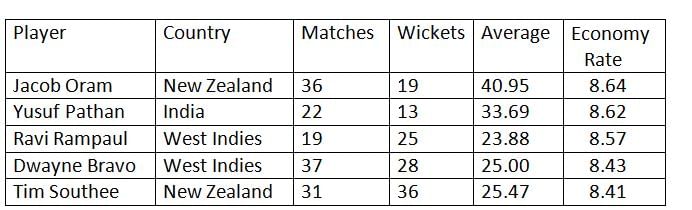 Here is the list of most expensive bowlers in Twenty20 internationals. New Zealand’s Jacob Oram tops the list with an economy of 8.64.