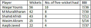 The list is headed by former Pakistan captain Waqar Younis with 10 five-wicket hauls.