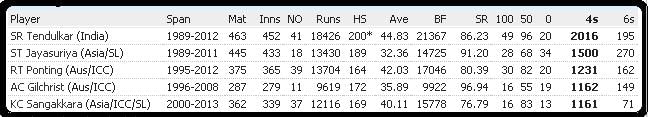 Sachin Ramesh Tendulkar finished his One Day International career with 2016 fours, which is the most by any cricketer in world cricket.