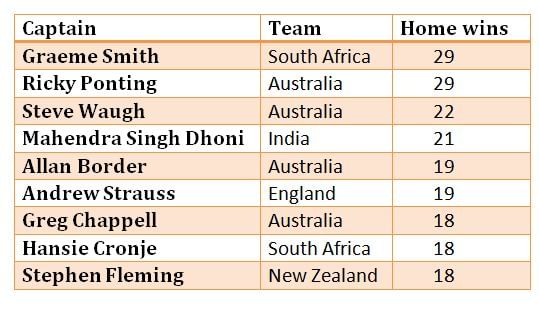 Here is a list of captains who have won the most number of home Test matches in the history of Test cricket. With a victory in the recently concluded Boxing Day Test match against India at Kingsmead in Durban, Graeme Smith, together with Ricky Ponting, tops the list with 29 home wins.