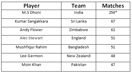 Indian captain M.S Dhoni leads the list of most international games played as a Wicket-keeper captain. He has played 250 games as Indian captain. Dhoni is followed by Sri Lanka’s Kumar Sangakkara and Andy Flower.