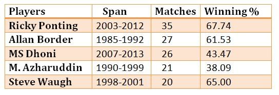 Here is a list of players who have played the most number of matches as captain in the ODI matches between India and Australia. Having captained his team in 35 matches, Australia’s Ricky Ponting tops the list.